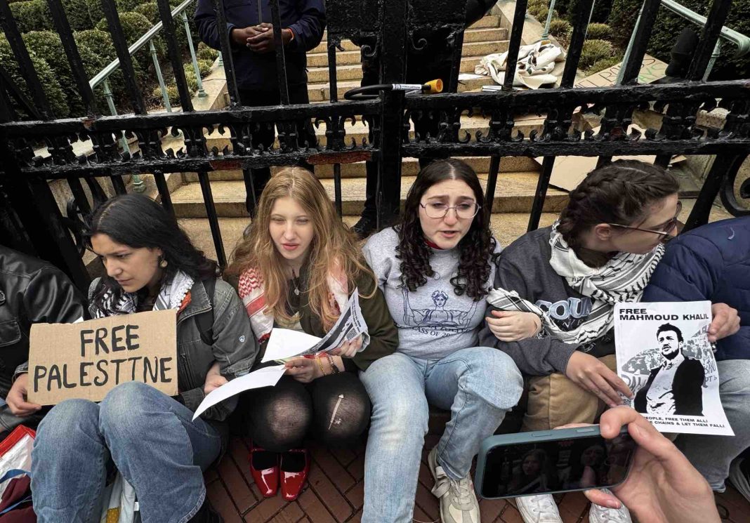 By Janet Ekstract, NEW YORK – In the early afternoon on April 2, Columbia University was the site where four Jewish pro-Palestinian demonstrators chained themselves to the gate near St. Paul’s Chapel to support detained Palestinian activist Mahmoud Khalil, a 2024 Columbia University graduate. Meanwhile, later Wednesday afternoon, a new group of protesters chained themselves to the Earl Hall gates in opposition to the U.S. Immigration and Customs Enforcement (ICE) nabbing of Khalil from his home, in front of his pregnant wife on March 8 of this year. The protesters stated: “We will be staying here until they meet the bare minimum demands, which is to tell us which trustee is responsible for informing on students and telling ICE confidential information which is leading to their kidnapping.” The students in a Columbia Palestine Solidarity Coalition (CPSC) release read: “We refuse to accept the ongoing genocide in Gaza, carried out through the investments of our trustees, as normal,” adding – “We refuse to accept the kidnapping of our friends as the new normal.” Also announced in an Instagram post was an emergency rally outside the chapel gates at 6:30 p.m. by Columbia University Alumni for Palestine.