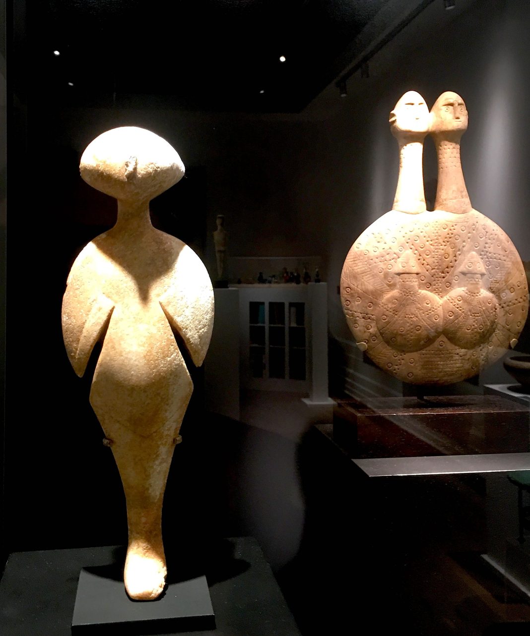 Cenevre ve New York’ta satış ofisleri bulunan Phoenix Antik Sanat Galerisi’nde satışa sunulan eserlerden biri, Christie’s Müzayede Evi’nde rekor fiyata satılan “Yıldız Avcısı”ndan daha büyük ebatlarda, MÖ 3000 ve 2500 döneminde Bakır Çağı’na ait “Mermer Yıldız Avcısı”. Yaklaşık 5 bin yıllık heykel, 24,1 santimetre boyunda ve 8,1 santimetre genişliğinde. Heykelin 1966’dan bu yana İsviçre’nin güneyindeki Ticino’da M. Croci koleksiyonundayken, 2017’de ABD’de özel bir koleksiyona geçtiği öğrenildi. Anadolu topraklarından çıkarılan ve galeride satışa sunulan bir başka eser de “Anıtsal İki Başlı İdol” adlı mermer heykel. MÖ 3000 dönemi Erken Bronz Çağı’na ait heykel, 33 santimetre uzunluğunda ve 22,5 santimetre genişliğinde. Bu eser de 1966’da M. Croci özel koleksiyonuna girmiş.