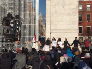 New York’ta aralarında, Hristiyan ve Yahudilerin de olduğu kalabalık, Müslümanlarla birlikte Trump’ın 1. yılına giren göçmenler konusundaki ilk yürütme kararı olan bazı İslam ülkesi vatandaşlarına vize yasağı getiren ve mülteci kabulünü durdurmasını içeren Başkanlık kararnamesini protesto etti.