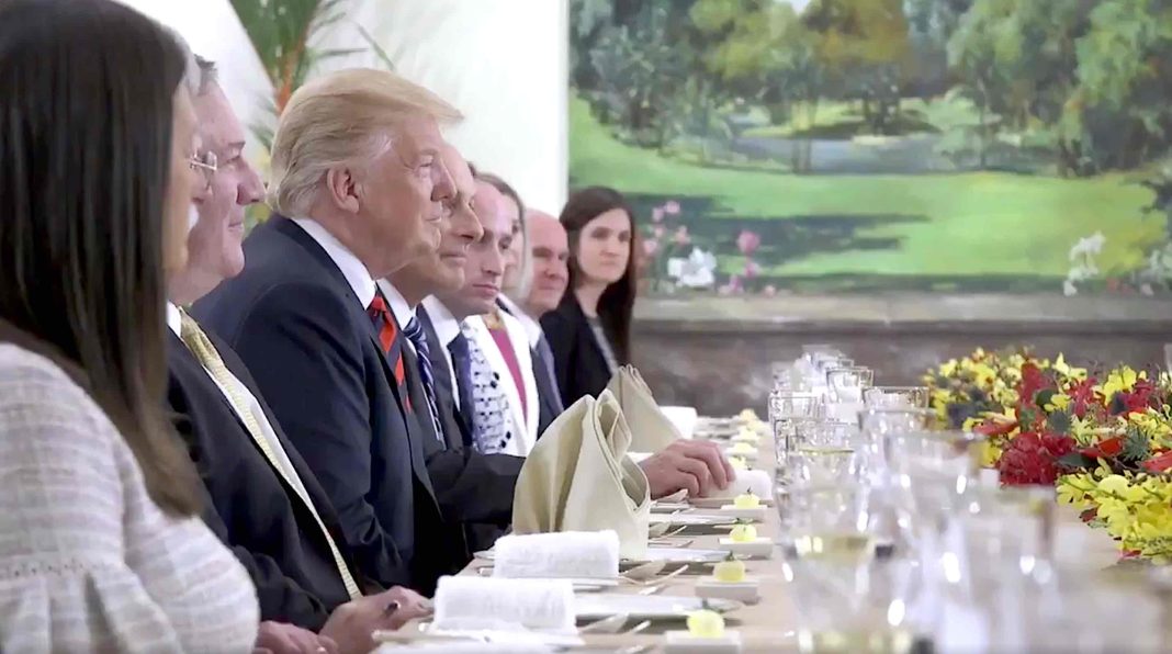 Trump taze meyvelerle süslü masadaki doğum günü pastasındaki tek mumu üfleyerek söndürdü. Yemekte Trump’a doğum günü pastası ile birlikte ıstakoz da ikram edildi.