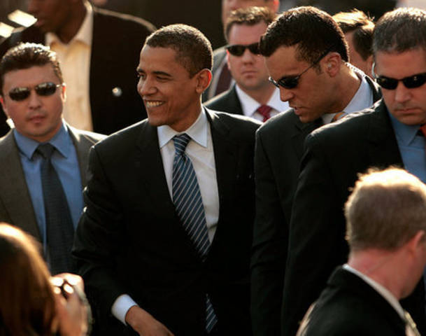 Obama, daha sonra kendisini karşılamak üzere alana gelen heyetle tokalaşarak sohbet etti.