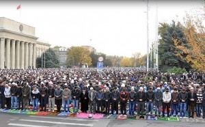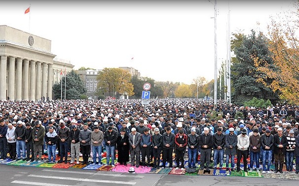 Kırgızistan’ın başkenti Bişkek’te bayram namazını kılmak için her yıl olduğu gibi on binlerce vatandaş Başbakanlık binasının önündeki alanı tercih etti. Meydana sığmayan vatandaşlar, ara sokakları ve park alanlarını doldurdu.