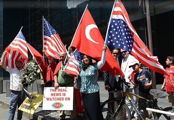 Protesto gösterisinde Amerikan ve Türk bayrakları açıldı.