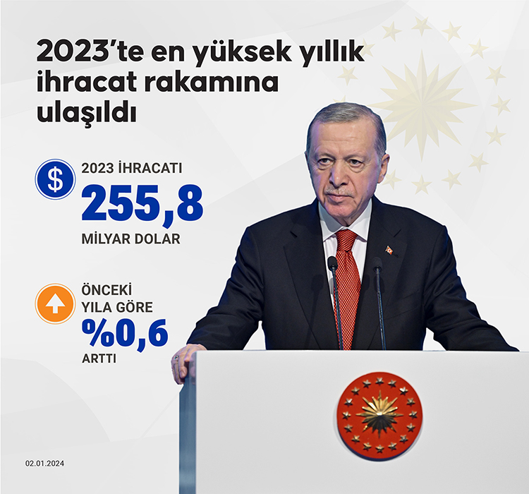 “2023 yılı ihracatımız geçen yıla göre yüzde 0,6 oranında artışla 255 milyar 809 milyon dolara ulaşarak, Cumhuriyet tarihimizin rekorunu kırmıştır”