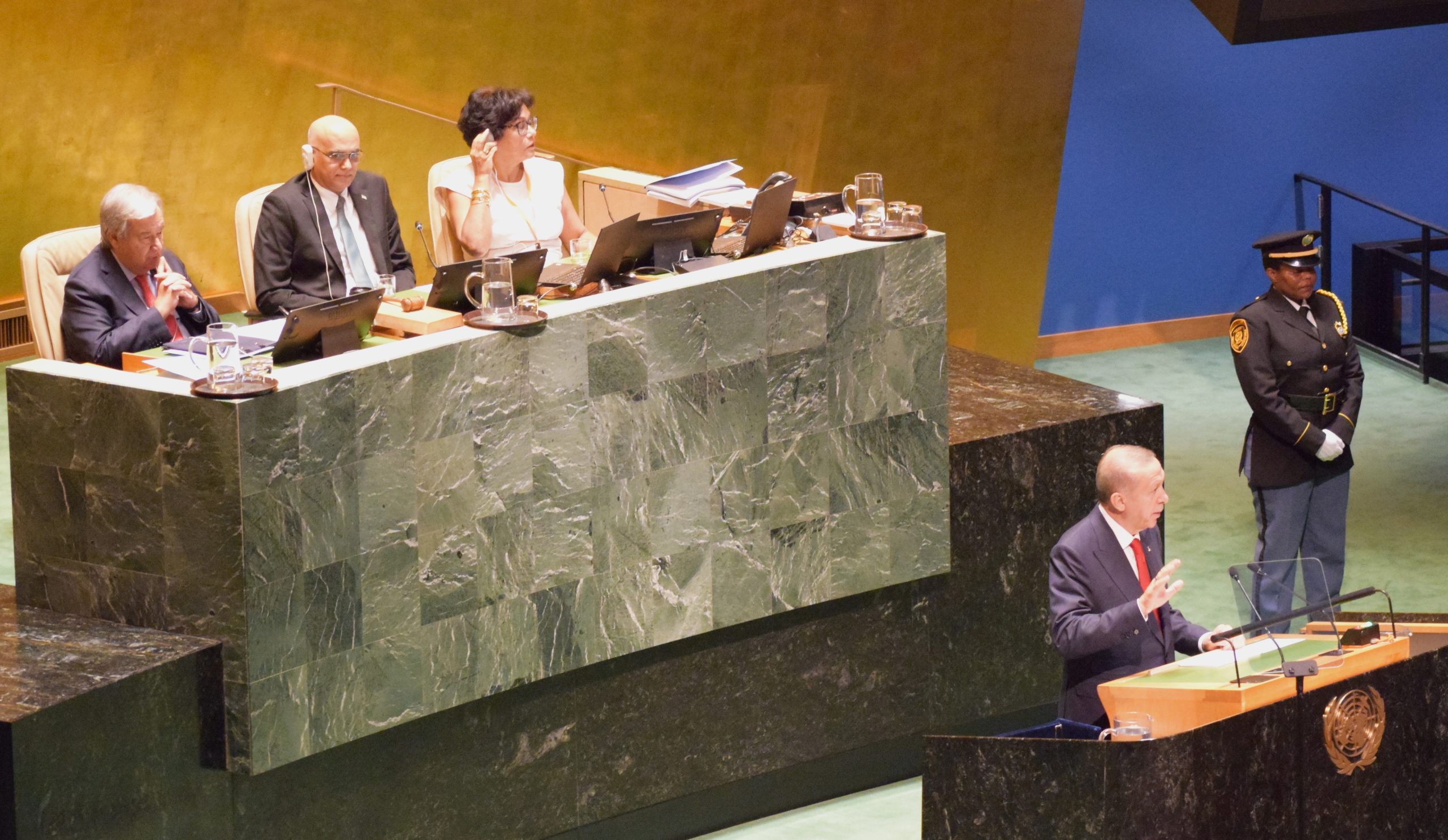 BİRLEŞMİŞ MİLLETLER (TURKISHJOURNAL)- Dilek Kaya – Cumhurbaşkanı Recep Tayyip Erdoğan’ın 2023 BM Genel Kurulu’nda yaptığı konuşmada, Türkiye’nin hem bölgesel hem de küresel düzeyde aktif rolünü vurguladı. Erdoğan, dünyanın çeşitli bölgelerini etkisi altına alan insani krizlere, siyasi çatışmalara ve toplumsal gerilimlere dikkat çekerek, küresel ekonomik sorunlar karşısında bu sorunlara çözüm bulmanın zorluğuna değindi.