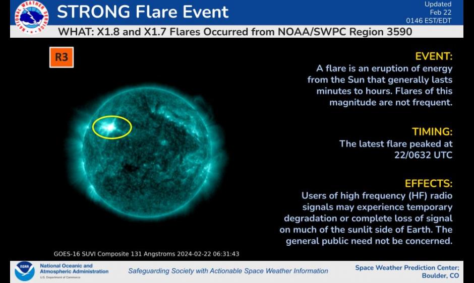 Ulusal Okyanus ve Atmosfer İdaresi (NOAA) tarafından yapılan açıklamada, güneşin “güçlü manyetik karmaşıklık sergileyen” bir bölgesinden patlamalar gerçekleştiği belirtildi. NOAA açıklamasında ayrıca; “geçici sinyal bozulmaları ya da sinyal kaybı yaşanabilir. Kamuoyunun endişelenmesine gerek yok” ifadelerine yer verdi.