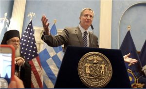 Yunan Bağımsızlık Günü nedeniyle Yunan Halkını kutlamak için biraraya gelindiğini belirten Belediye Başkanı Bill de Blasio, “ Ben özellikle birkaç konuda sizlere teşekkürlerimi sunmak istiyorum,” dedi misafirlere, ve devam etti. “Demokrasi: biz hakikaten sizsiz yapamazdık (de Blasio dahil, herkes güldü). Felsefe kavramı ile düşünmemize yardımcı olduğunuz için teşekkür ederim. Ve eğlendirilmek ve aydınlatılmaktan hoşlanan insanlar için ‘drama’ kavramını getirdiğiniz için teşekkür ederim.(..) ve hepsi Yunanistan’da başladı”.