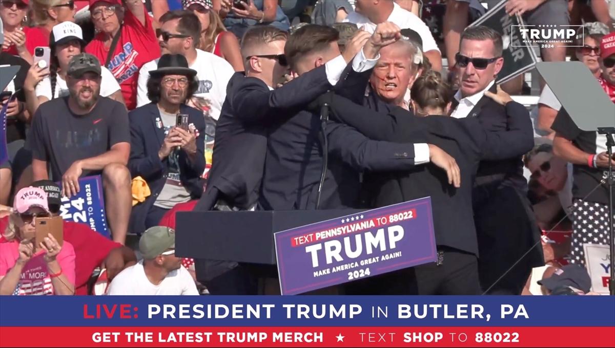Sosyal medyada paylaşılan görüntülerde, Trump, eyaletin Butler şehrinde kürsüde konuşurken, yaklaşık 7 el silah sesine benzer patlama duyuldu.