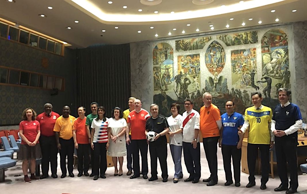 Dünya Kupası onuruna düzenlenen etkinlikte, BMGK’nın 5 daimi üyesi ABD, Rusya, Fransa, İngiltere ve Çin ile birlikte, geçici üyeler Hollanda, Polonya, İsveç, Kazakistan, Peru, Bolivya, Etiyopya, Kuveyt, Ekvator Ginesi ve Fildişi Sahili büyükelçileri milli futbol takımlarının formalarını giyerek resim çektirdiler.