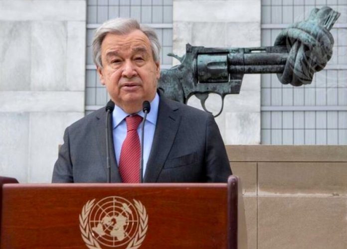 Genel Sekreter Guterres, İsveçli sanatçı Carl Fredrik Reuterswärd’ın şiddet karşıtı “Düğümlü Tabanca” heykeli önünde Rusya işgali altındaki Ukrayna’daki savaşla ilgili gazetecilere açıklamalarda bulundu.