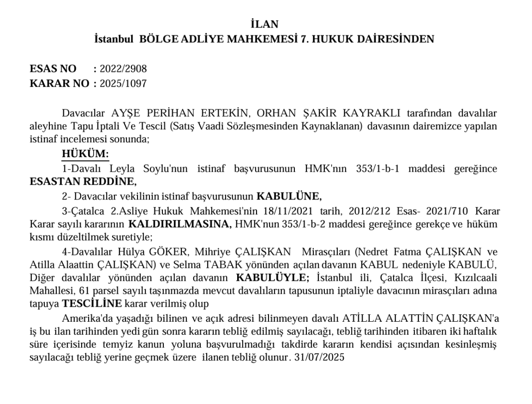 Amerika’da yaşadığı bilinen ve açık adresi bilinmeyen davalı ATİLLA ALATTİN ÇALIŞKAN’a iş bu ilan tarihinden yedi gün sonra kararın tebliğ edilmiş sayılacağı, tebliğ tarihinden itibaren iki haftalık süre içerisinde temyiz kanun yoluna başvurulmadığı takdirde kararın kendisi açısından kesinleşmiş sayılacağı tebliğ yerine geçmek üzere ilanen tebliğ olunur. 31/07/2025