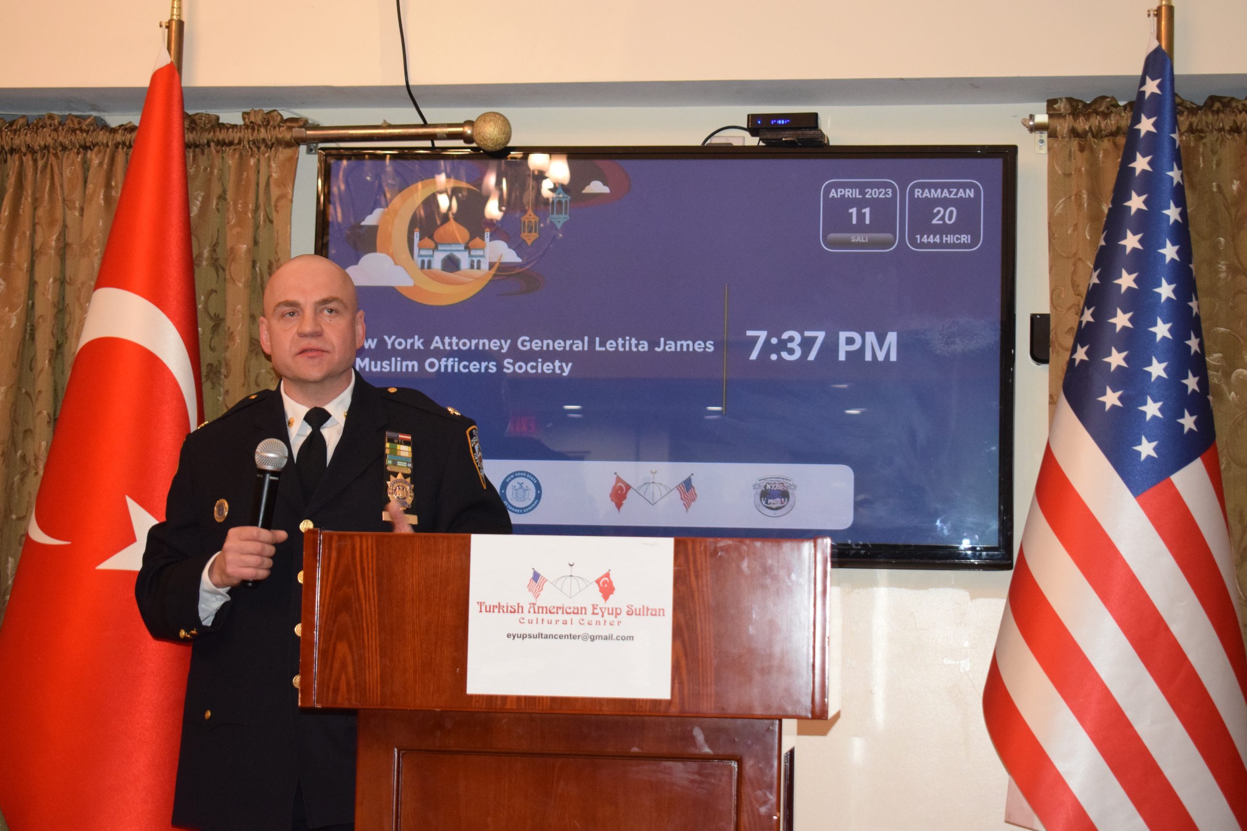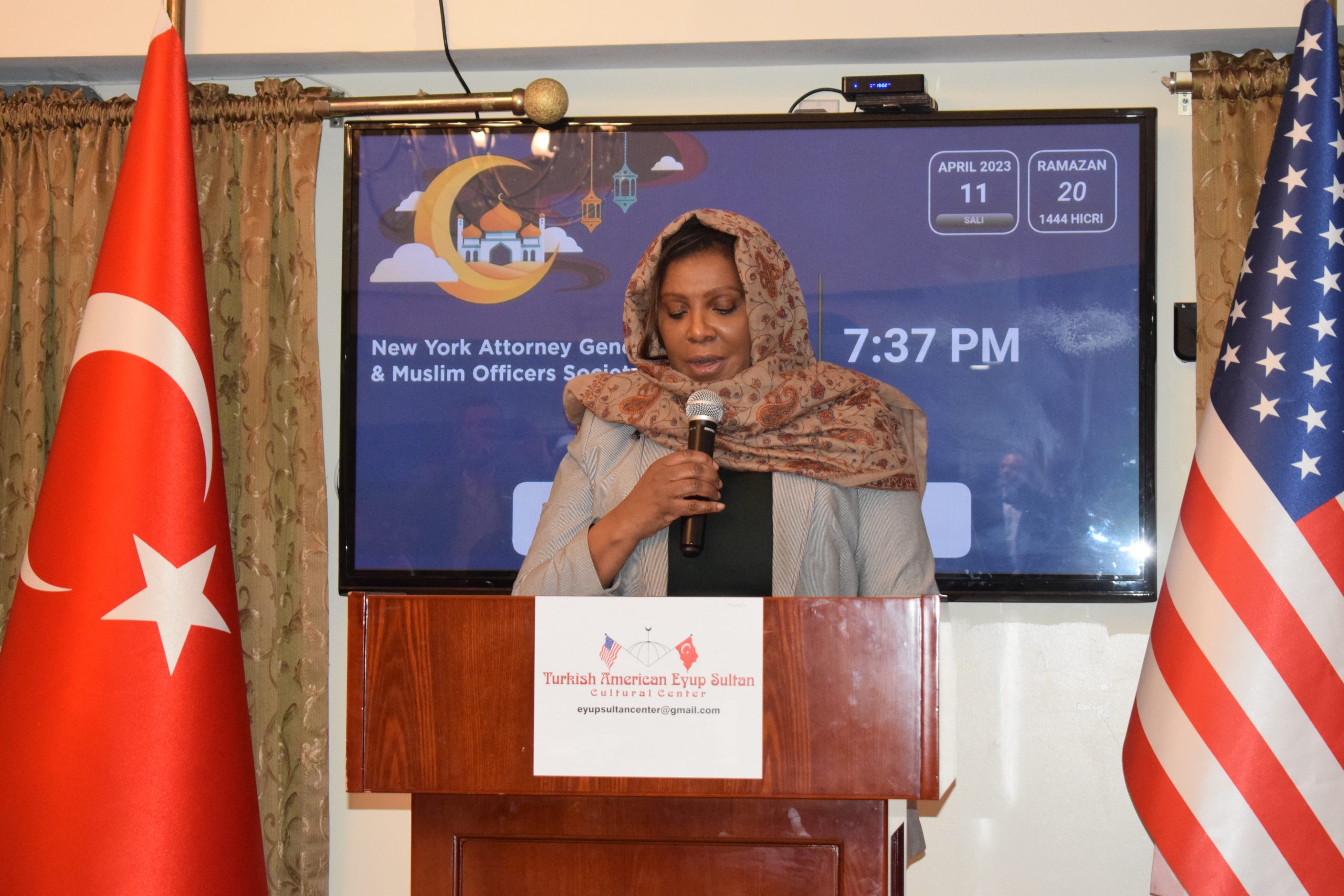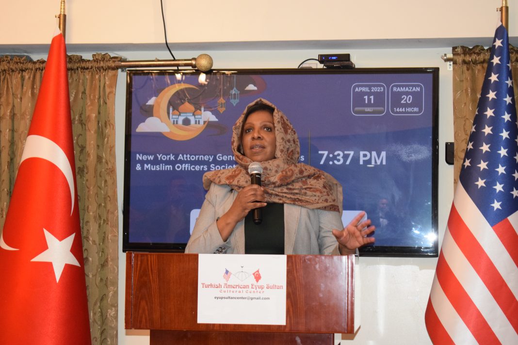 NEW YORK (TURKISH JOURNAL) – Dilek Kaya – New York Başsavcısı Letitia James, New York Polis Teşkilatı (NYPD) Müslüman Polisler Derneği ile birlikte Brooklyn’deki Eyüp Sultan Camisi’nde New York’ta yaşayan Müslüman toplumuna iftar yemeği verdi.