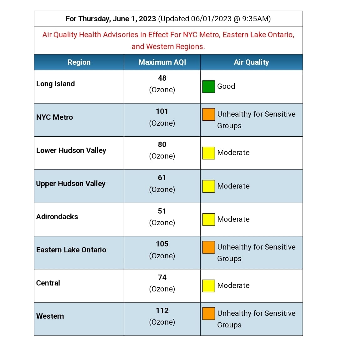 Ulusal Hava Durumu ofisi tarafından paylaşılan raporda New York şehri için bölgeler halinde hava kalitesi durumu belirtildi. Özellikle bugün New York şehrinde sabah saat 11:00’den gece saat 11:00’e kadar çocukların ve solunum problemi olan yetişkinlerin dikkatli olması, mümkün olduğunca uzun süreli veya ağır efor sarfedecek aktivitelerden kaçınılması tavsiye edildi.