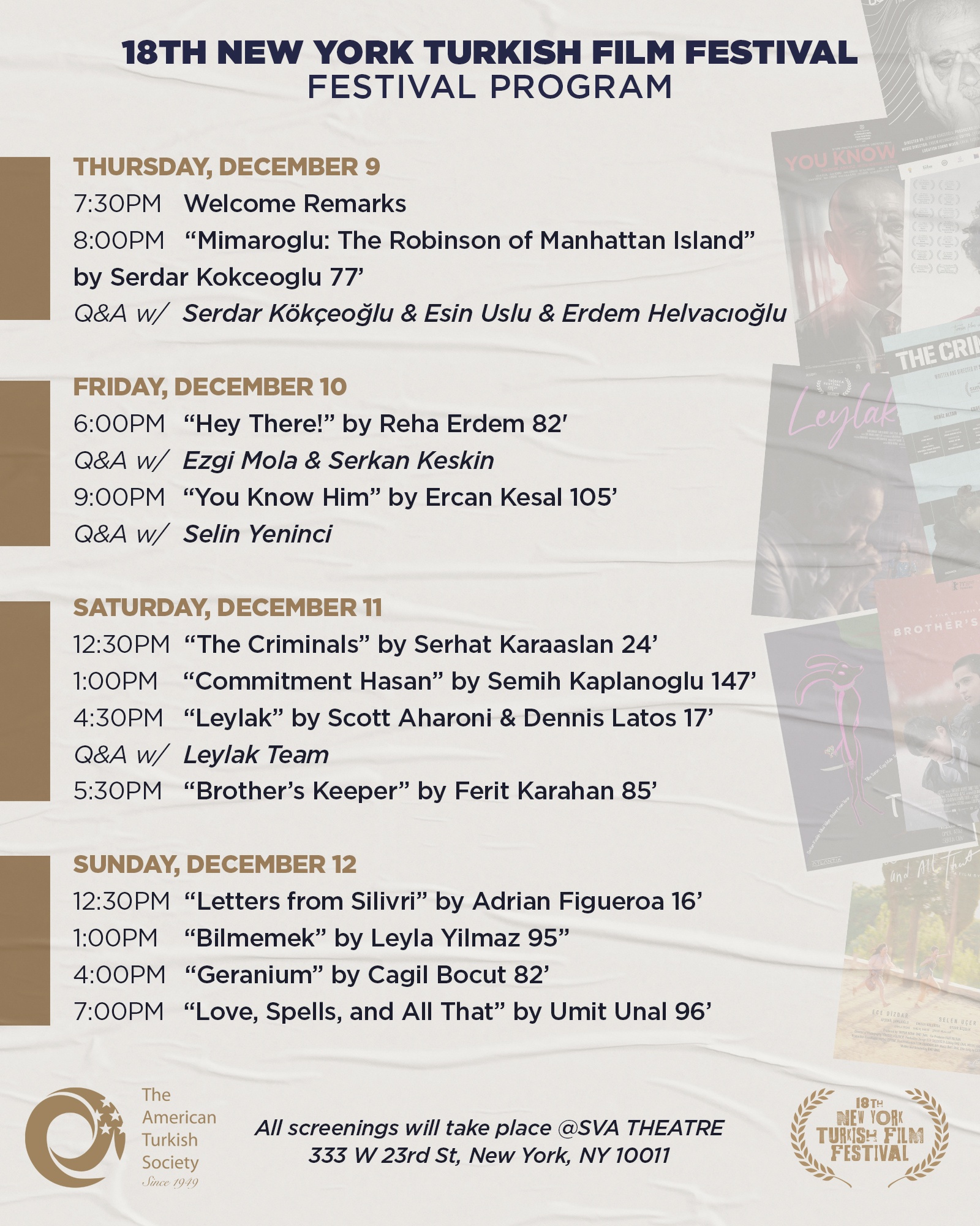 1949 yılında kurulan ve kurulduktan sonra ABD ile Türkiye arasında köprüler kurmak amacıyla gerçekleştirdiği faaliyetleriyle öne çıkan en eski Türk-Amerikan kuruluşlarından biri olan Amerikan-Türk Cemiyeti’nin (The American Turkish Society-ATS) 18 yıldır düzenlediği NYTFF, 9 Aralık’ta başlayacak.