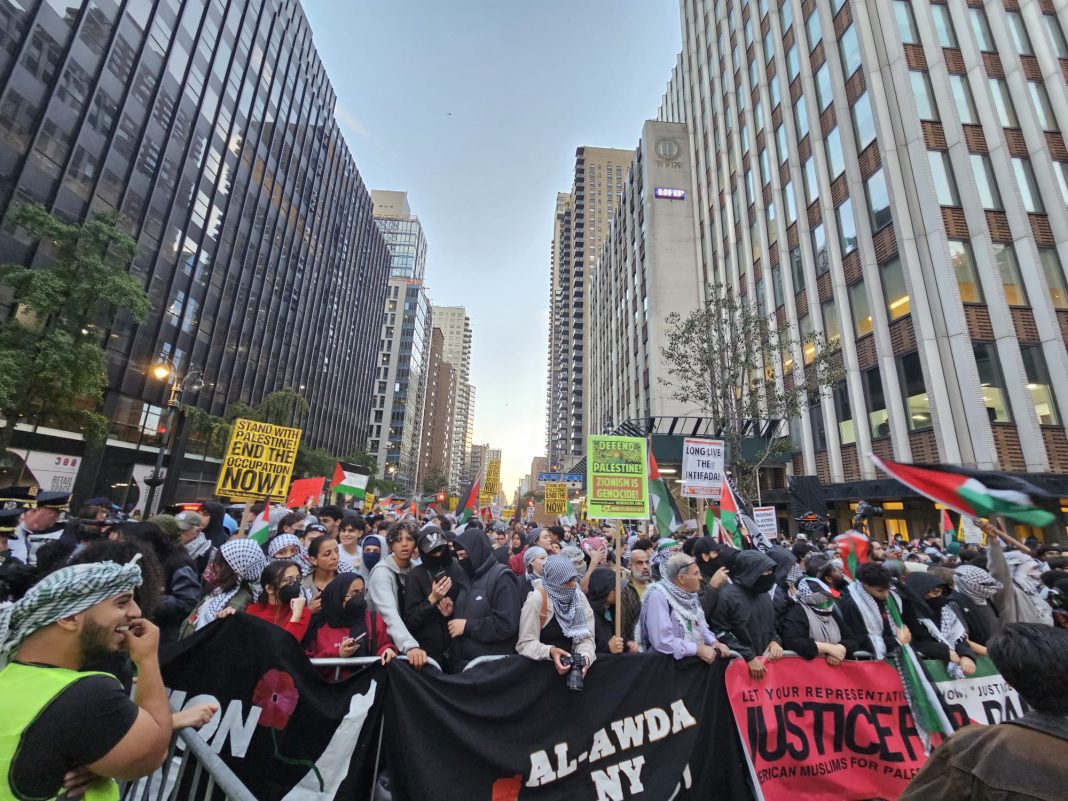 NEW YORK (TURKISH JOURNAL) – Dilek Kaya – İsrail – Filistin arasındaki çatışmalar sürmeye devam ederken, New York’ta bugün binlerce Filistin yanlısı gösterici Times Meydanı’nda bir araya geldi.