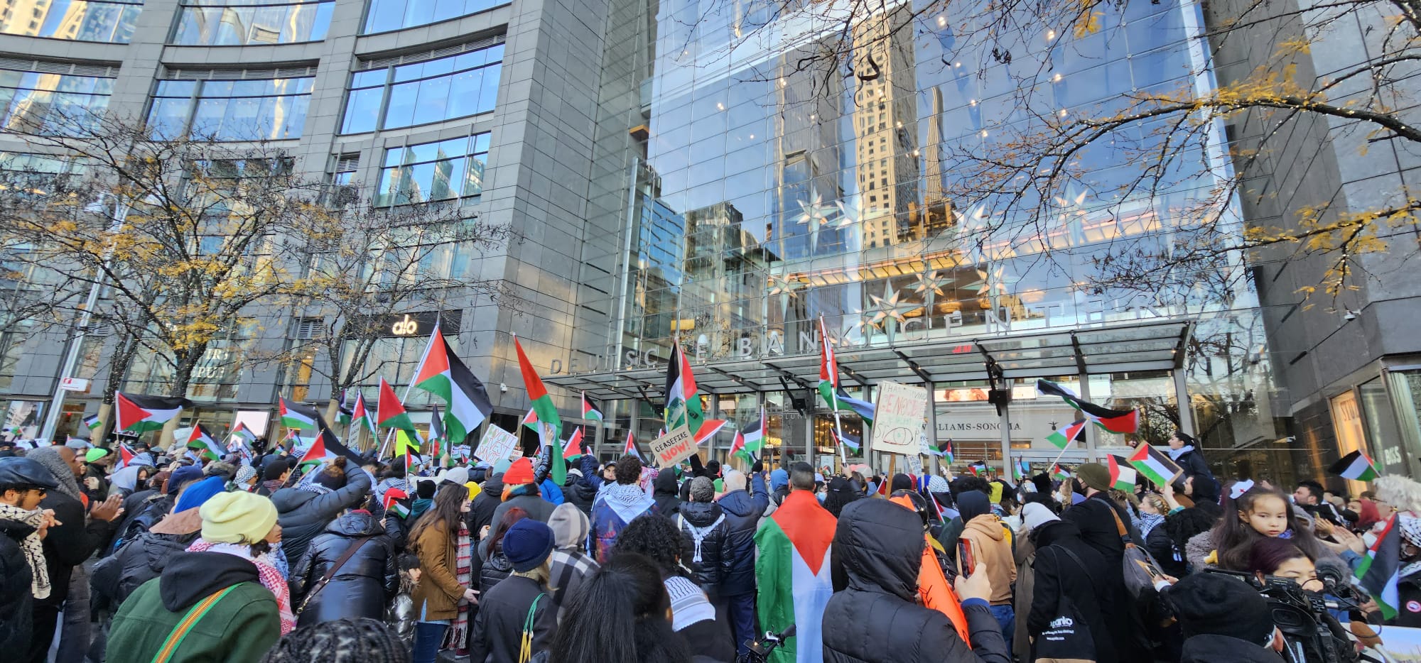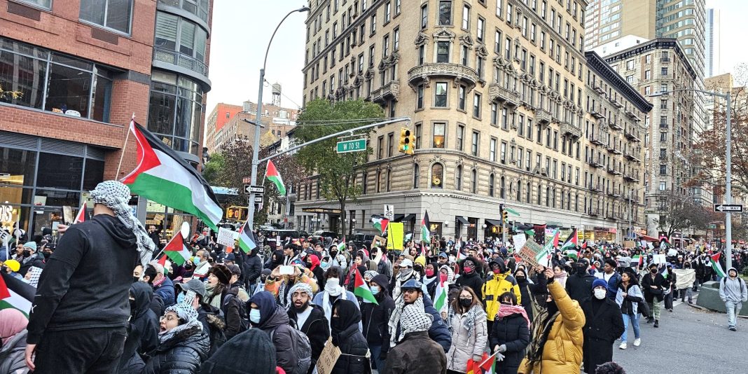 NEW YORK (TURKISH JOURNAL) – Dilek Kaya – New York’taki Filistin’e destek gösterisinde, İsrail işgali ve saldırılarının yanında, Şükrangünü haftasonu alışverişi yapanlar göstericilerin hedefinde yer aldı.