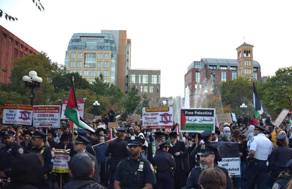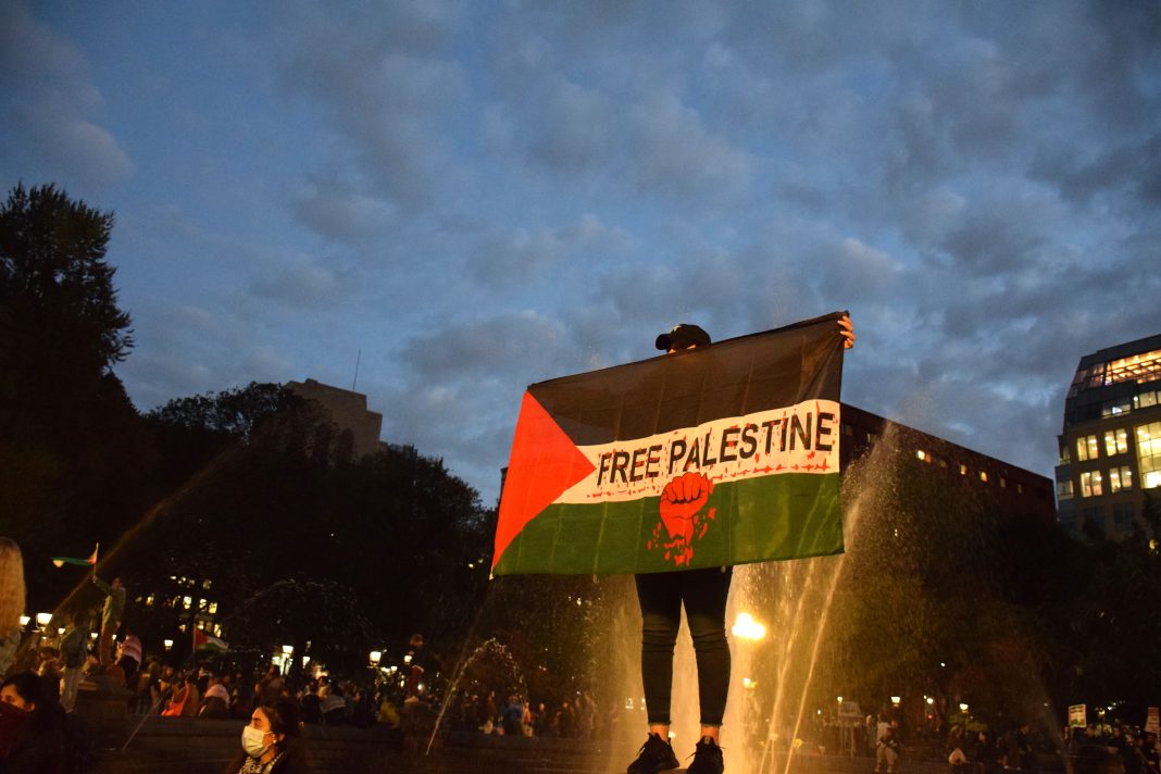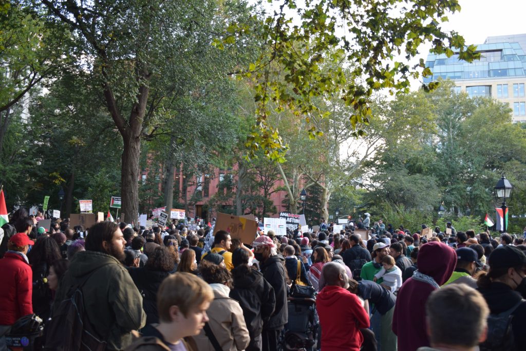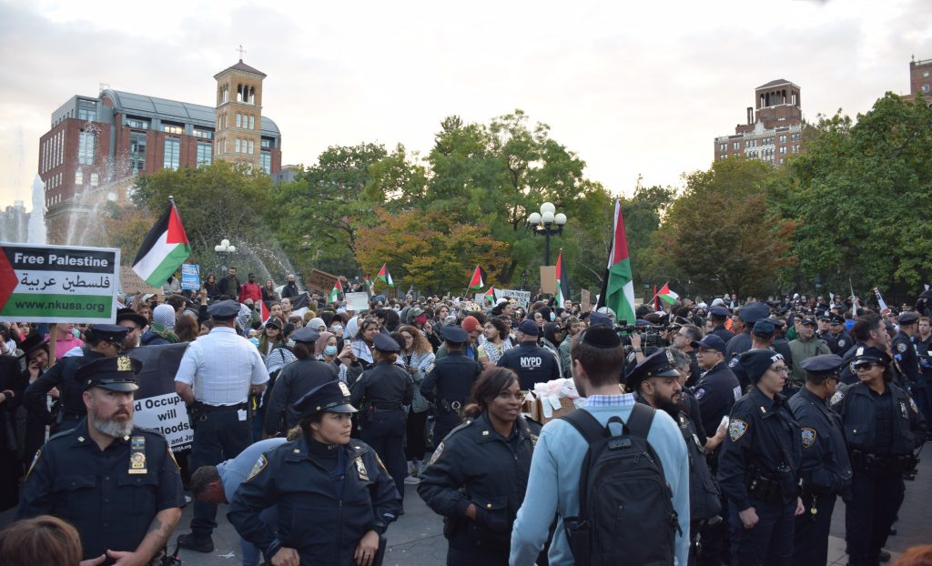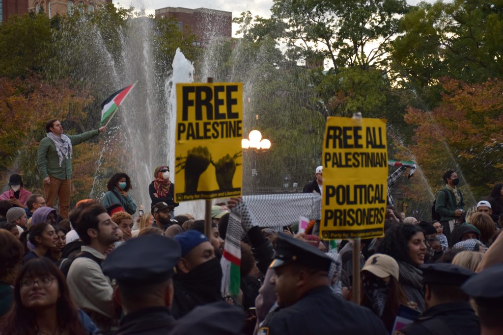 Washington Square Park’ta bir araya gelen Filistin yanlıları, İsrail’in Gazze’ye yönelik katliama varan sadırılarını kınayan bir gösteri düzenledi.