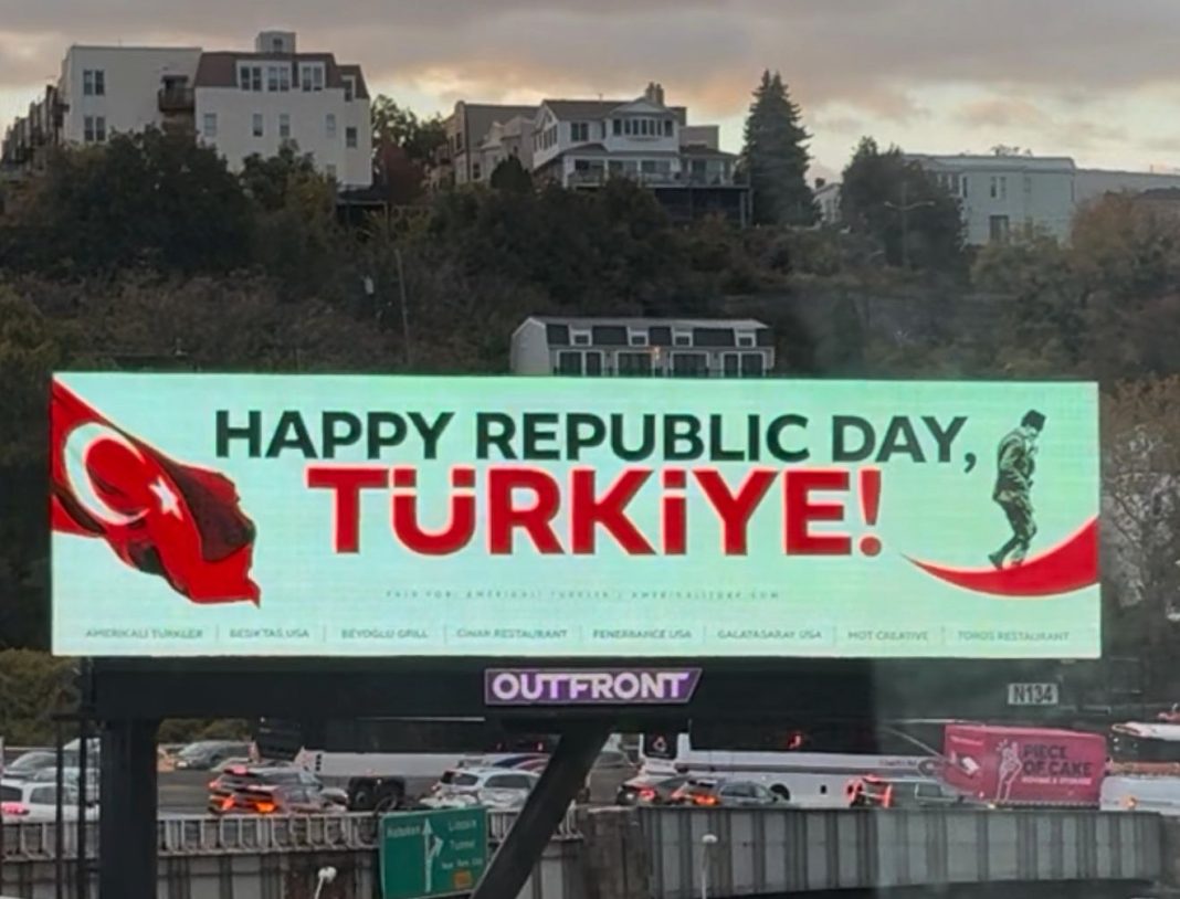 (TURKISH JOURNAL) – Amerika Birleşik Devletleri’nin New York kentinde, her gün yüz binlerce aracın geçtiği Lincoln Tüneli girişinde, 29 Ekim Cumhuriyet Bayramı dolayısıyla Türk bayrağı billboardlarda yer aldı. “Happy Republic Day Türkiye” mesajının yer aldığı görsel, Türk toplumu tarafından büyük beğeniyle karşılandı.