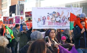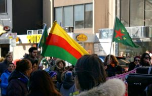 TORONTO (TURKISH JOURNAL) – PKK/PYD terör örgütü yandaşları, Kanada’nın Toronto kentindeki Kadın Günü yürüyüşünü, Türkiye’nin Afrin’de terör ögrütü mensuplarına yönelik başlattığı Zeytin Dalı Harekatına karşı çaldıkları Türkülerle propaganda kendilerine propaganda aracı yaptı.