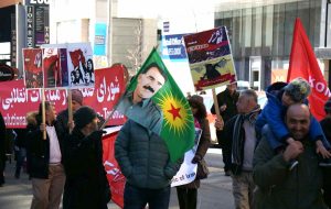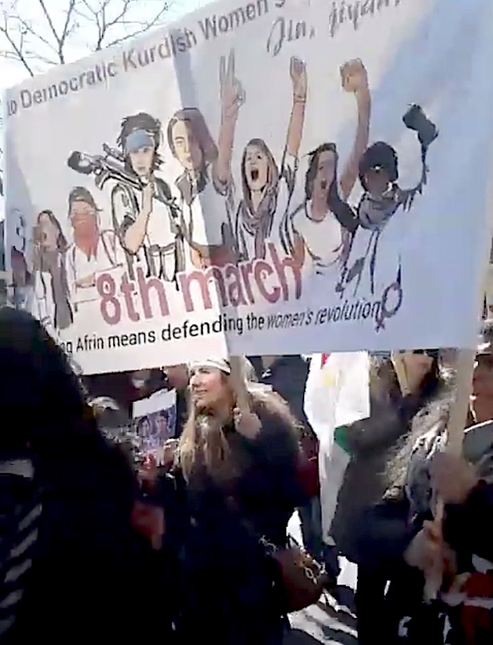 Afrin harekatına karşı pankarlarla birlikte terör elebaşı Abdullah Öcalan’ın resmini ve terör örgütü YPG bayrağını taşıyan grup, pankarlarının birinde, İngilizce “Afrin’i savunmak, kadın haklarını savunmak” ifadesini kullanarak propaganda yaptı.