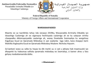 Somali’nin Dışişleri Bakanlığı’nın yaptığı açıklamada, BM’nin Haysom’u, Somali’de “protokolleri ihlal etmek” ve “kasıtlı müdahalede bulunmak” ile suçladı.