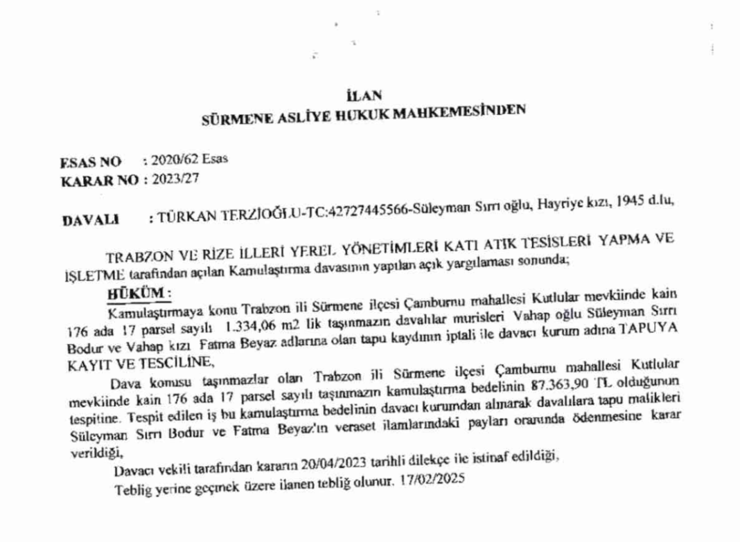 Kamulaştırmaya konu Trabzon ili Sürmene ilçesi Çamburnu Mahallesi Kutlular mevkiinde kain 176 ada 17 parsel sayılı 1.334,06 m²’lik taşınmazın davalılar mirasçileri Vahap oğlu Süleyman Sırrı Bodur ve Vahap kızı Fatma Beyaz adlarına olan tapu kaydının iptali ile davacı kurum adına TAPUYA KAYIT VE TESCİLİNE,