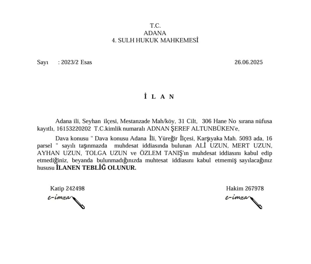 Dava konusu, “Dava konusu Adana İli, Yüreğir İlçesi, Karşıyaka Mahallesi, 5093 ada, 16 parsel” sayılı taşınmazda muhdesat iddiasında bulunan ALİ UZUN, MERT UZUN, AYHAN UZUN, TOLGA UZUN ve ÖZLEM TANIŞ‘ın muhdesat iddasını kabul edip etmediğiniz, beyanda bulunmadığınızda muhtesat iddiasını kabul etmemiş sayılacağınız hususu İLANEN TEBLİĞ OLUNUR.