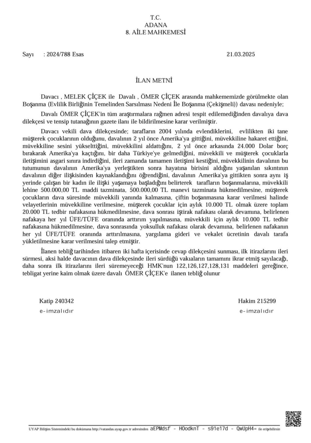 Davacı MELEK ÇİÇEK ile Davalı ÖMER ÇİÇEK arasında mahkememizde görülmekte olan Boşanma (Evlilik Birliğinin Temelinden Sarsılması; Nedeni ile Boşanma (Çekişmeli) davası nedeniyle:
