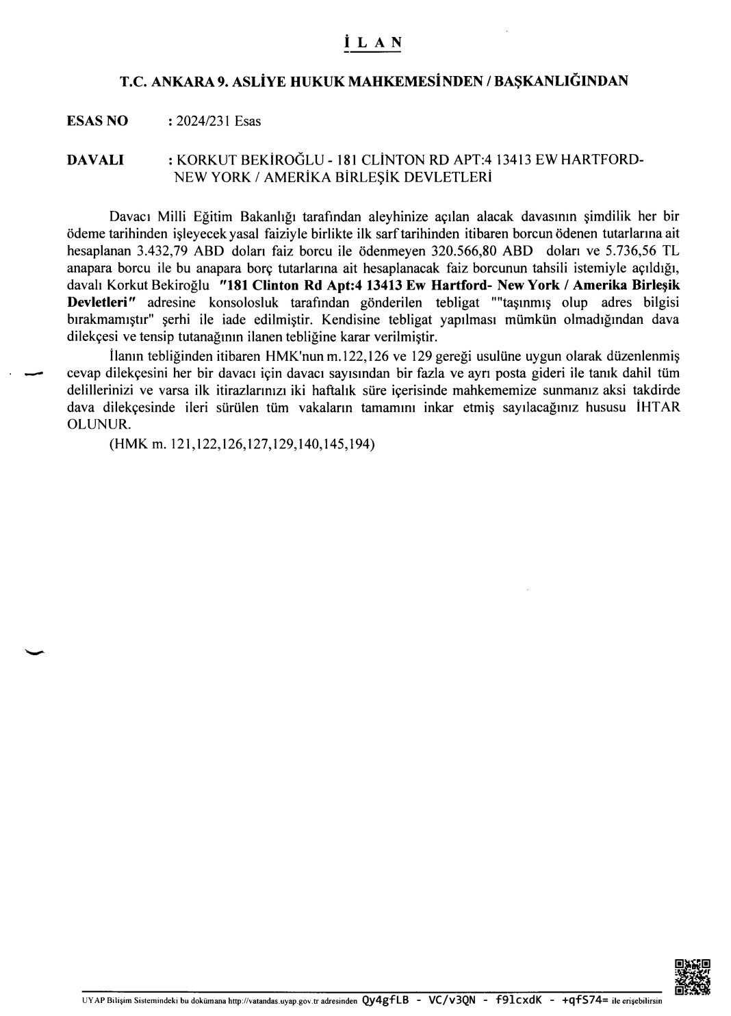 Davacı Milli Eğitim Bakanlığı tarafından aleyhinize açılan alacak davasının şimdilik her bir ödeme tarihinden işleyecek yasal faiziyle birlikte ilk sarf tarihinden itibaren borcun ödenen tutarlarına ait hesaplanan 3.432,79 ABD doları faiz borcu ile ödenmeyen 320.566,80 ABD doları ve 5.736,56 TL anapara borcu ile bu anapara borç tutarlarına ait hesaplanacak faiz borcunun tahsili istemiyle açıldığı, davalı Korkut Bekiroğlu “181 Clinton Rd Apt:4 13413 Ew Hartford- New York / Amerika Birleşik Devletleri” adresine konsolosluk tarafından gönderilen tebligat “taşınmış olup adres bilgisi bırakmamıştır” şerhi ile iade edilmiştir. Kendisine tebligat yapılması mümkün olmadığından dava dilekçesi ve tensip tutanağının ilanen tebliğine karar verilmiştir.