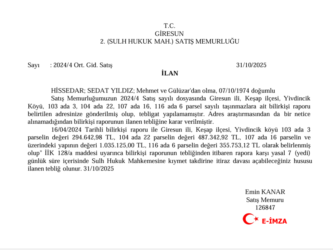 HİSSEDAR; SEDAT YILDIZ; Mehmet ve Gülüzar’dan olma, 07/10/1974 doğumlu Satış Memurluğumuzun 2024/4 Satış sayılı dosyasında Giresun ili, Keşap ilçesi, Yivdincik Köyü, 103 ada 3, 104 ada 22, 107 ada 16, 116 ada 6 parsel sayılı taşınmazlara ait bilirkişi raporu belirtilen adresinize gönderilmiş olup, tebligat yapılamamıştır. Adres araştırmasından da bir netice alınamadığından bilirkişi raporunun ilanen tebliğine karar verilmiştir. 16/04/2024 Tarihli bilirkişi raporu ile Giresun ili, Keşap ilçesi, Yivdincik köyü 103 ada 3 parselin değeri 294.642,98 TL, 104 ada 22 parselin değeri 487.342,92 TL, 107 ada 16 parselin ve üzerindeki yapının değeri 1.035.125,00 TL, 116 ada 6 parselin değeri 355.753,12 TL olarak belirlenmiş olup” İİK 128/a maddesi uyarınca bilirkişi raporunun tebliğinden itibaren rapora karşı yasal 7 (yedi) günlük süre içerisinde Sulh Hukuk Mahkemesine kıymet takdirine itiraz davası açabileceğiniz hususu ilanen tebliğ olunur. 31/10/2025
