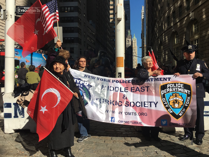New York Borsası’nı simgeleyen boğa heykelinin bulunduğu Bowling Green Parkı’nda bayrak çekme törenine New York Polis Teşkilatı (NYPD) Ortadoğu ve Turki Toplum (NYDPMTS) de destek verirken, derneği temsilen NYPD’de görev yapan Türk polis Arif Taşören katıldı.